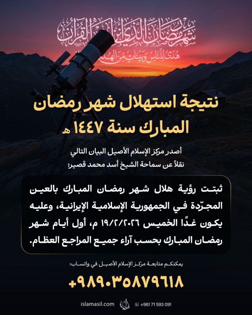 ثبتت رؤية هلال شهر رمضان المبارك بالعين المجرّدة في الجمهورية الإسلامية الإيرانية، وعليه يكون غدًا الخميس 2026/2/19 م، أول أيام شهر رمضان المبارك بحسب آراء جميع المراجع العظام.