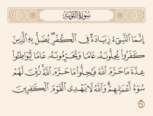 الجواب: النسيء مصدر كالنذير والنكير معناه التأخير، والمراد منه هنا تأخير الأشهر الحرم وغيرها من الأشهر القمريّة عمّا رتّبها الله سبحانه عليه، فإنّ العرب علموا
